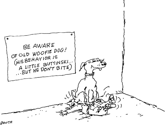 I love George Booth, whose cartoon is below. And, this cartoon of his (he often drew cats and dogs) is about as accurate a depiction of my darling Diego as I have found. He’s a lot, and for some – not all – people, he’s simply too much. Not a mean bone in his body – “but he don’t bite” – but…at 110 pounds of hair and muscle and legs and a huge head that has almost knocked me out on more than one occasion during play, yes, this ‘toon of a man struggling under Woofie Dog is about it.
